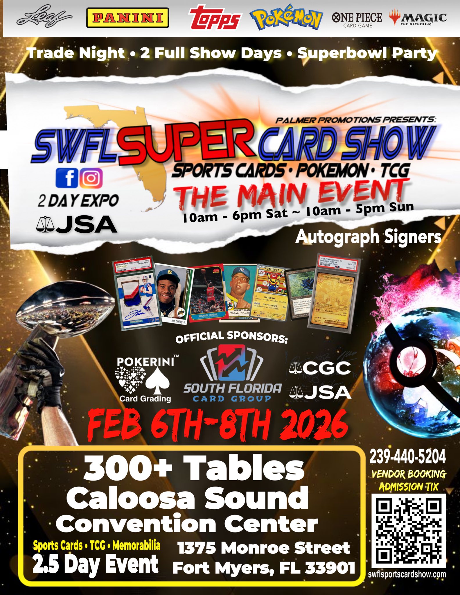 @swflsportscardshow π SWFL Super Card Show π February 6th β 8th, 2026 βΈ» π Friday, February 6th β Vendor Day & Trade Night β’ Vendor Setup: 5:00 PM β 7:00 PM β’ On-Site Trade Night: Immediately following setup β’ Kick off the weekend with early deals, trades, and networking βΈ» π Saturday, February 7th β Show Day 1 β’ VIP Early Entrance: 9:00 AM β’ General Admission: 10:00 AM β 7:00 PM β’ Full day of vendors, collectibles, and trading opportunities (with designated trade zones and bays available) β’ Plus enjoy football-themed games and contests with prizes and giveaways βΈ» π Sunday, February 8th β Show Day 2 + Super Bowl VIP Party β’ VIP Early Entrance: 9:00 AM β’ General Admission: 10:00 AM β 4:00 PM β’ Mo how action with vendors, trading, and football contests leading into the big game π Super Bowl VIP Party β 5:00 PM until after the game β’ Hosted at the finest convention center in the Tri-County area β’ Full bar service all evening β’ Giant screen viewing for the ultimate game-day atmosphere β’ Multiple couch seating areas plus round table tops for a relaxed, social Super Bowl experience β’ All-you-can-enjoy game day favorites: wings, pizza, appetizers & more TICKET WEBSITE COMING SOON πβ€οΈπ»ποΈ @Luminary Hotel and Calusa Sound Convention Center Downtown Fort Myers FL 400 tables